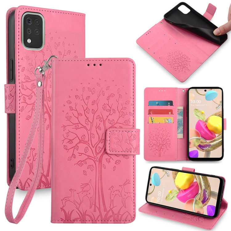 Funda de Cuero para LG K42 con Relieve de Árbol y Ciervo (Rosa)