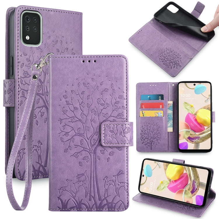 Funda para Teléfono LG K42 Cuero con Relieve Árbol y Ciervo (Púrpura)