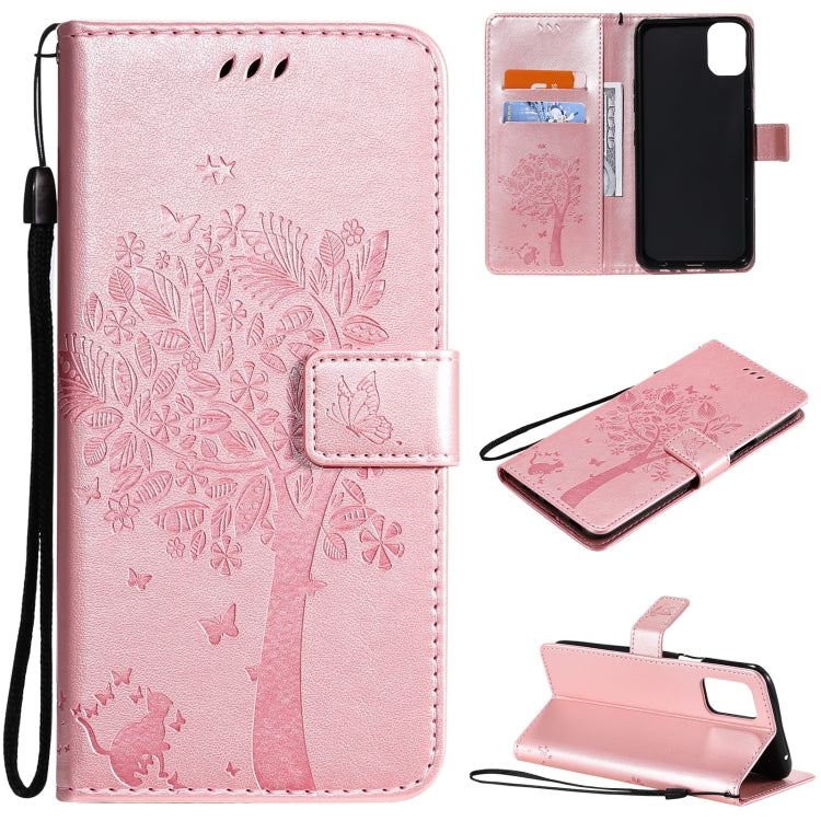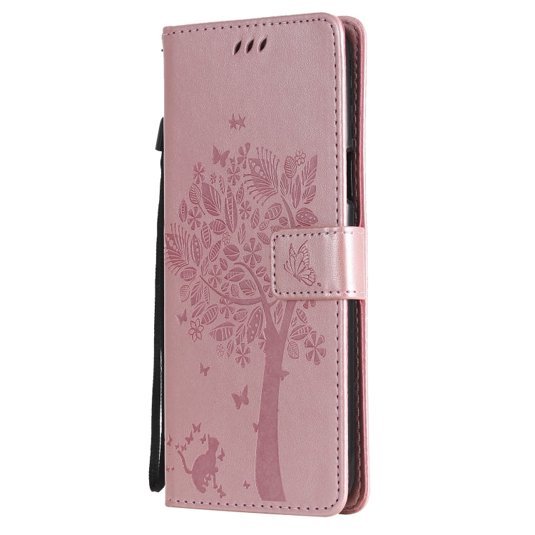 Funda Cuero PU para LG K42 con Patrón Tree & CAT, Titular, Tarjetero, Billetera y Cordón (Oro Rosa)