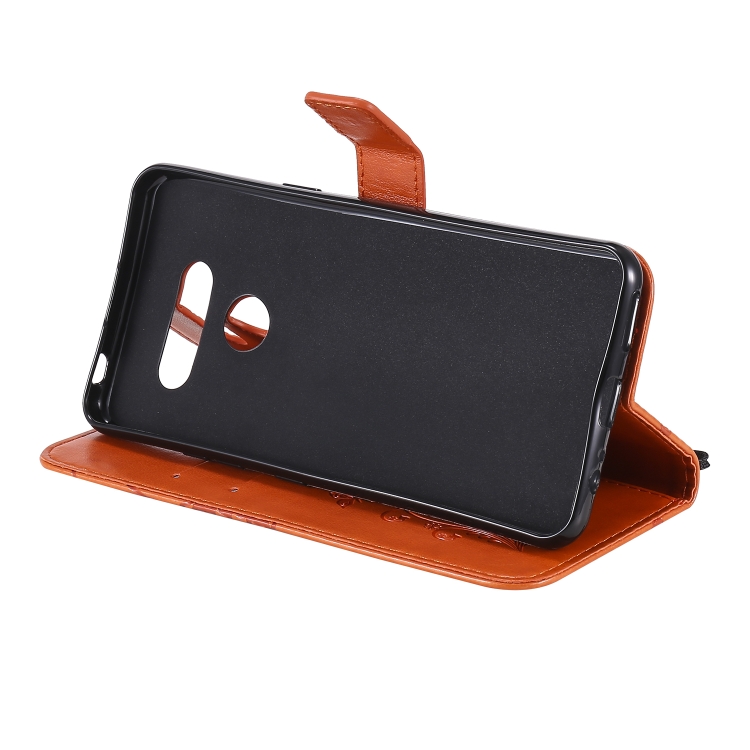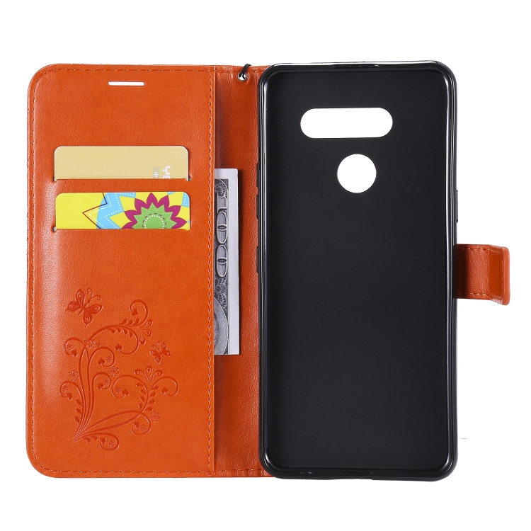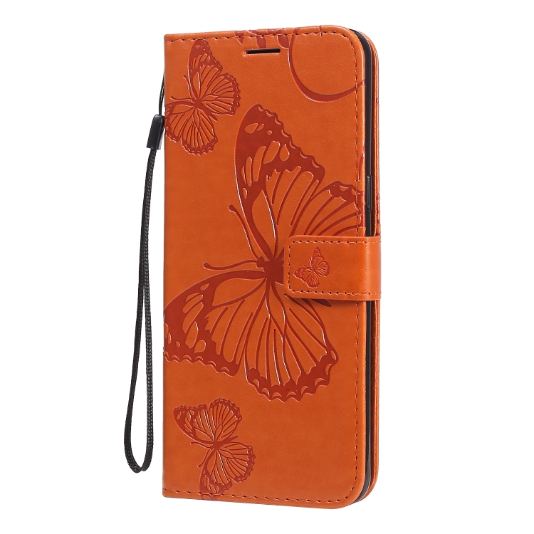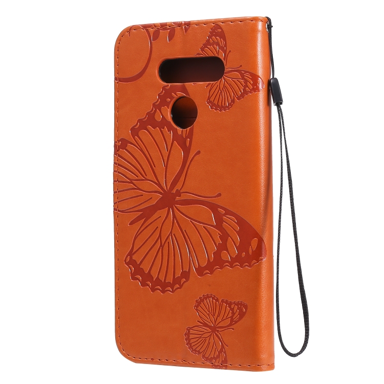 Funda de Cuero para LG K50S 3D con Mariposa en Relieve, Tapa Horizontal, Soporte, Ranura para Tarjeta y Cordón (Naranja)