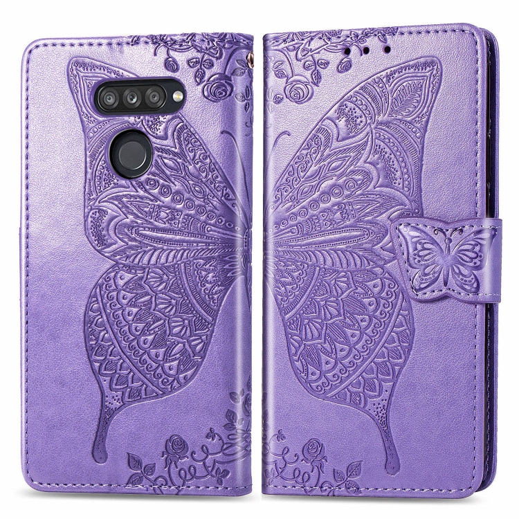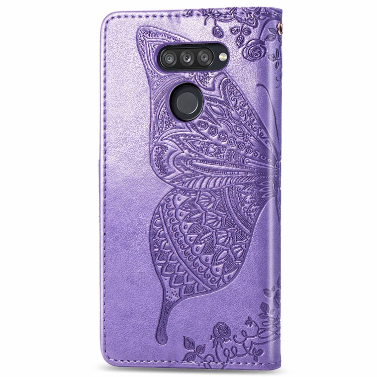 Funda de Cuero LG K50S Butterfly Love Flower con Tapa Horizontal, Soporte, Ranura para Tarjeta y Cordón (Morado Claro)