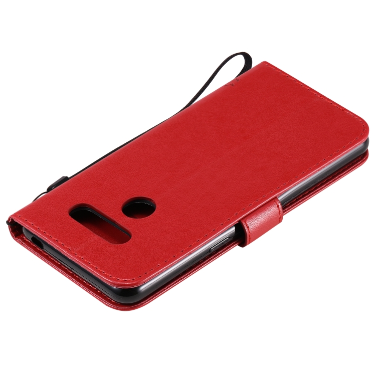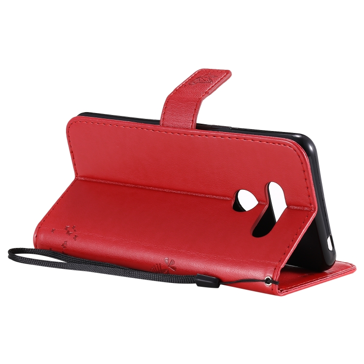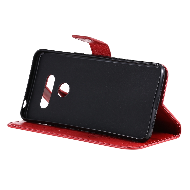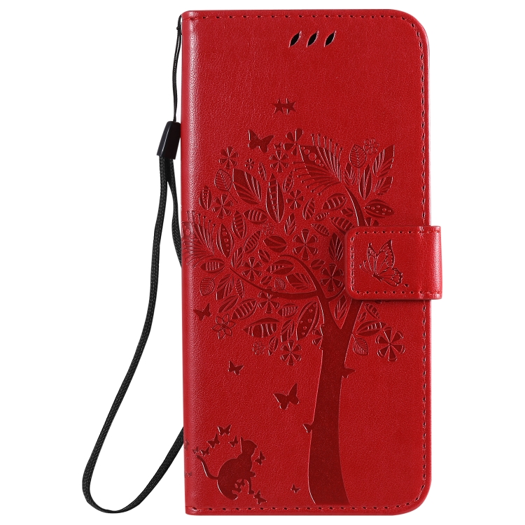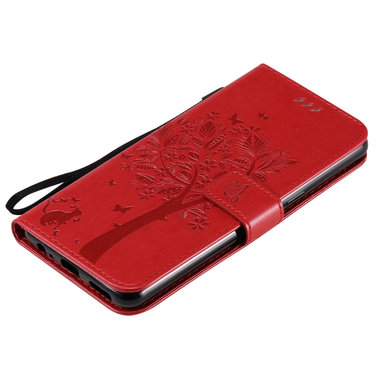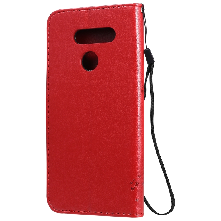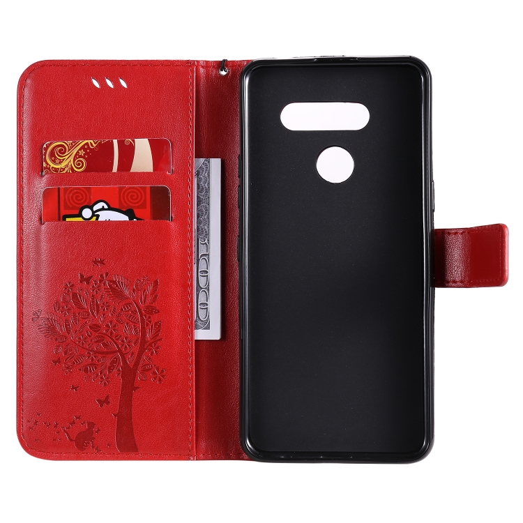 Funda de Cuero para LG K50S con Tapa Horizontal, Patrón Árbol y Gato, Soporte, Ranuras y Cordón (Rojo)