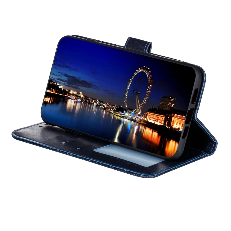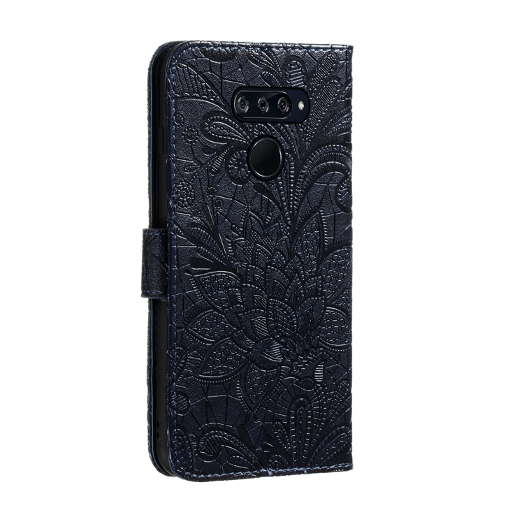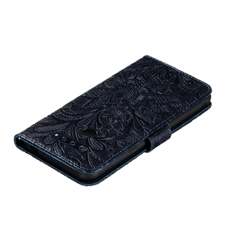 Funda de Cuero para LG K50S con Estampado de Flores, Tapa Horizontal, Soporte, Ranuras para Tarjetas y Cordón (Azul Oscuro)