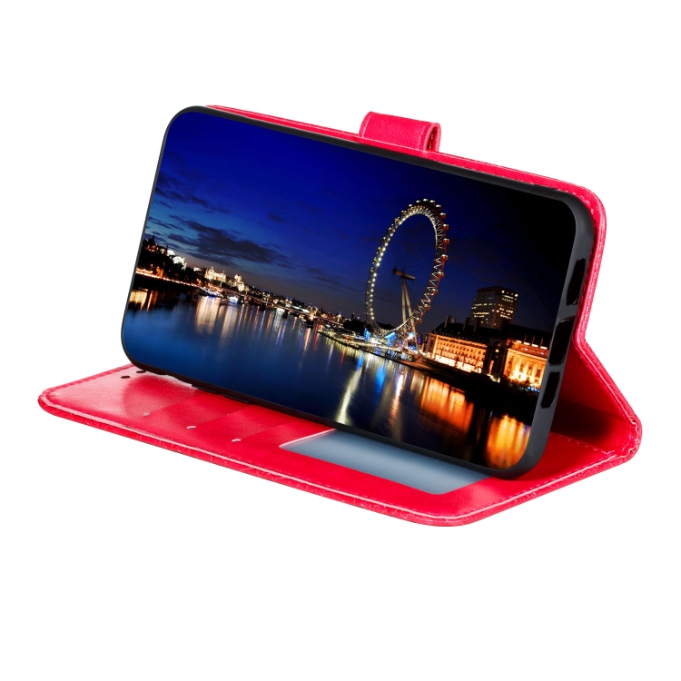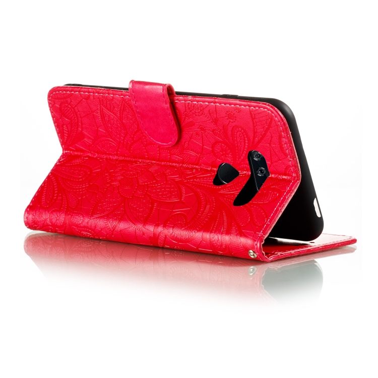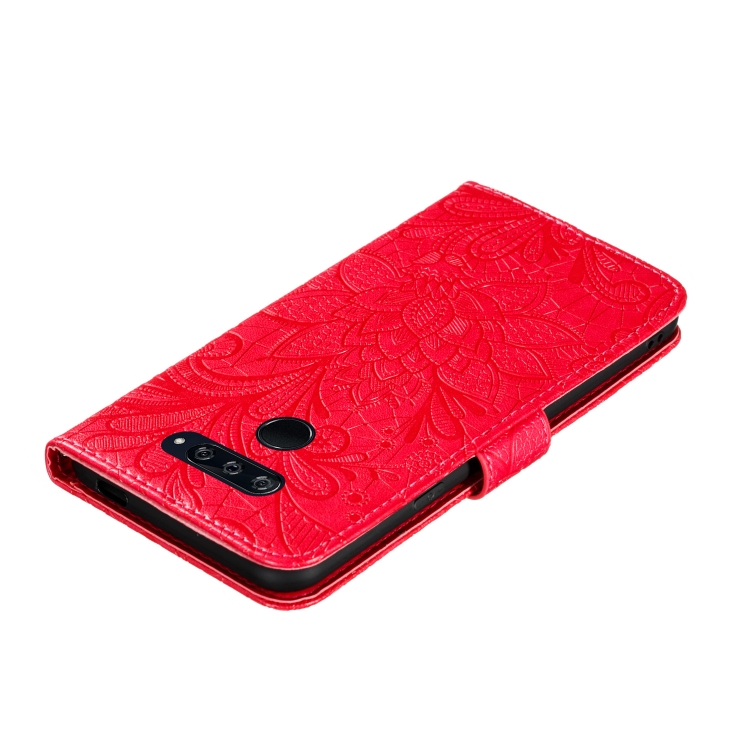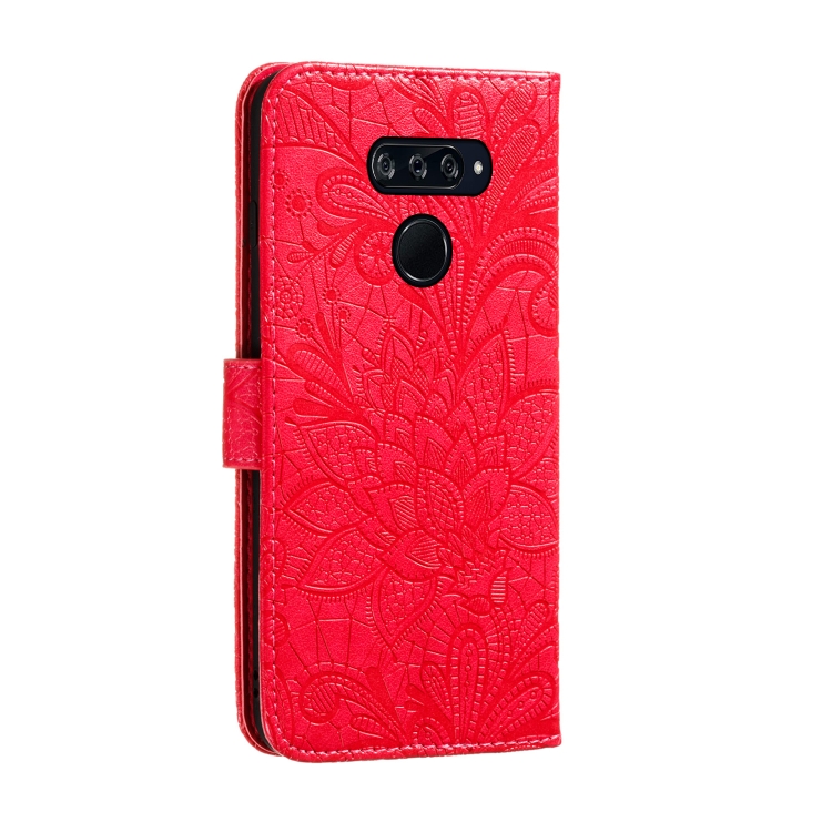 Funda de Cuero para LG K50S con Estampado de Flores, Tapa Horizontal, Soporte, Ranuras para Tarjetas, Billetera y Cordón (Rojo)