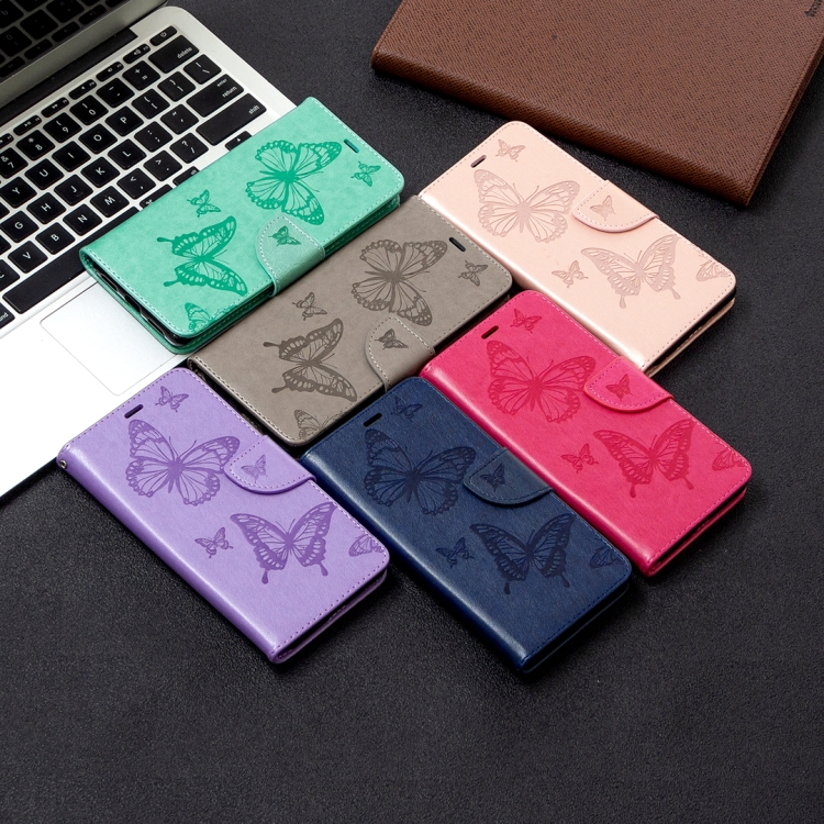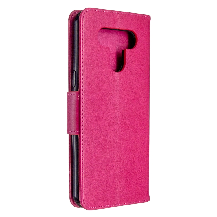 Estuche de Cuero para LG K51 con Diseño de Dos Mariposas, Soporte, Ranura para Tarjeta, Billetera y Cordón (Rosa Rojo)