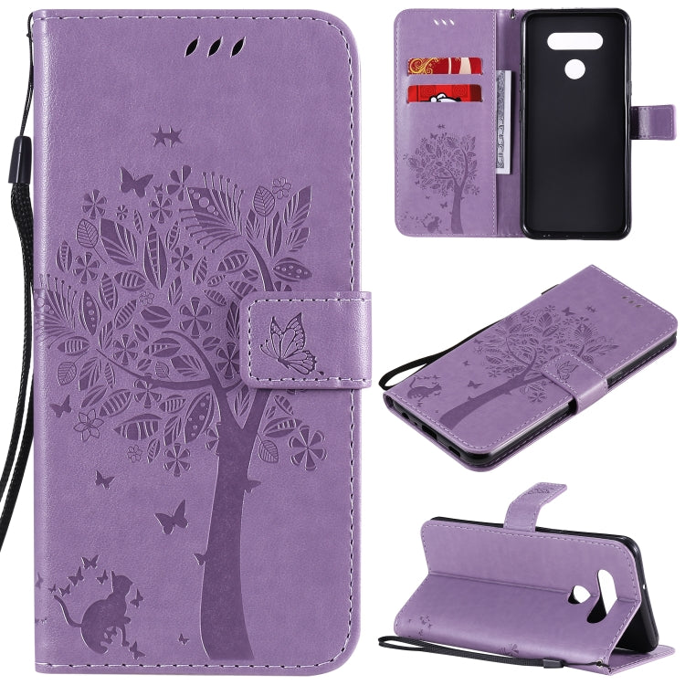 Funda de Cuero para LG K51 con Tapa Horizontal, Patrón Árbol y Gato, Soporte, Ranuras y Cordón (Morado Claro)