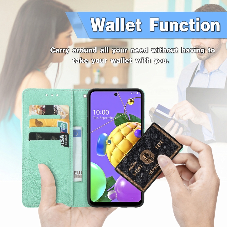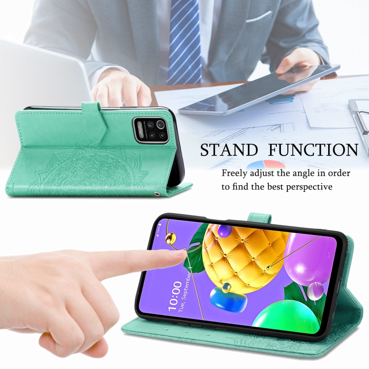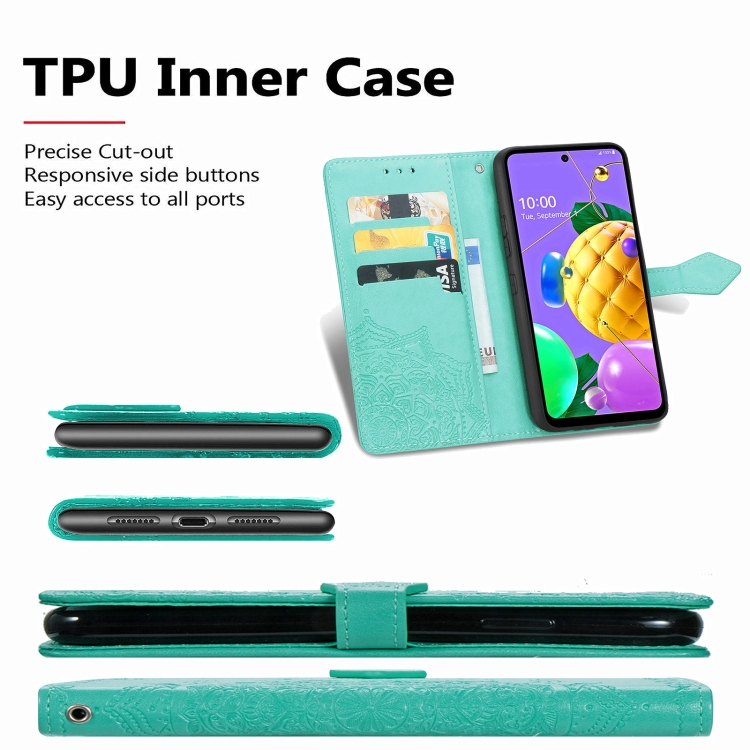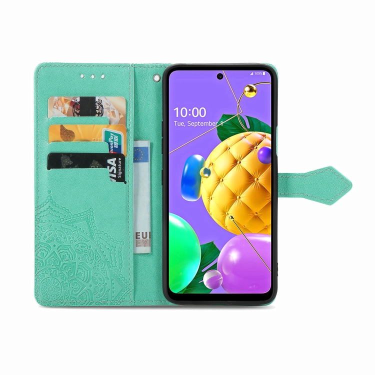 Funda de Cuero LG K52 Mandala Flower con Tapa Horizontal, Soporte, Ranuras y Cordón (Verde)