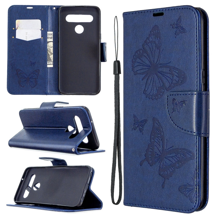 Funda de Cuero para LG K61 con Dos Mariposas en Relieve, Tapa Horizontal, Soporte, Ranura para Tarjeta y Billetera (Azul Oscuro)