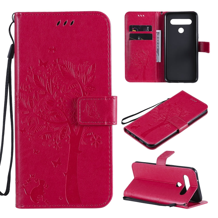 Funda de Cuero para LG K61 Tree & CAT con Tapa Horizontal, Soporte, Ranuras para Tarjetas, Billetera y Cordón (Rosa Roja)