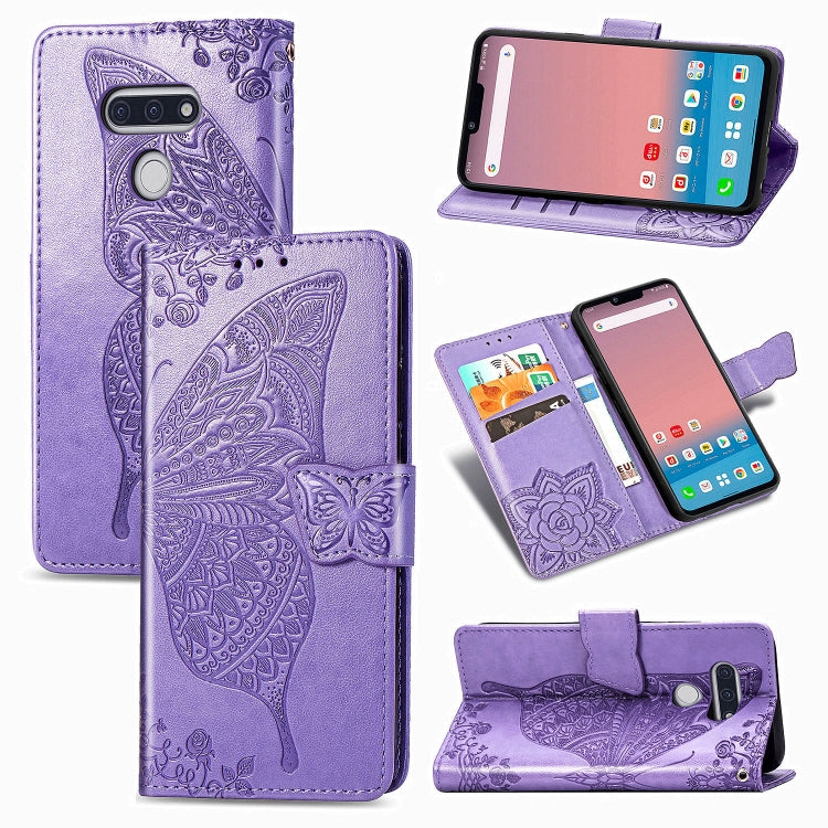 Funda de Cuero para LG Style3 L-41A Butterfly Love Flower con Tapa Horizontal, Soporte, Ranura para Tarjeta y Cordón (Morado Claro)