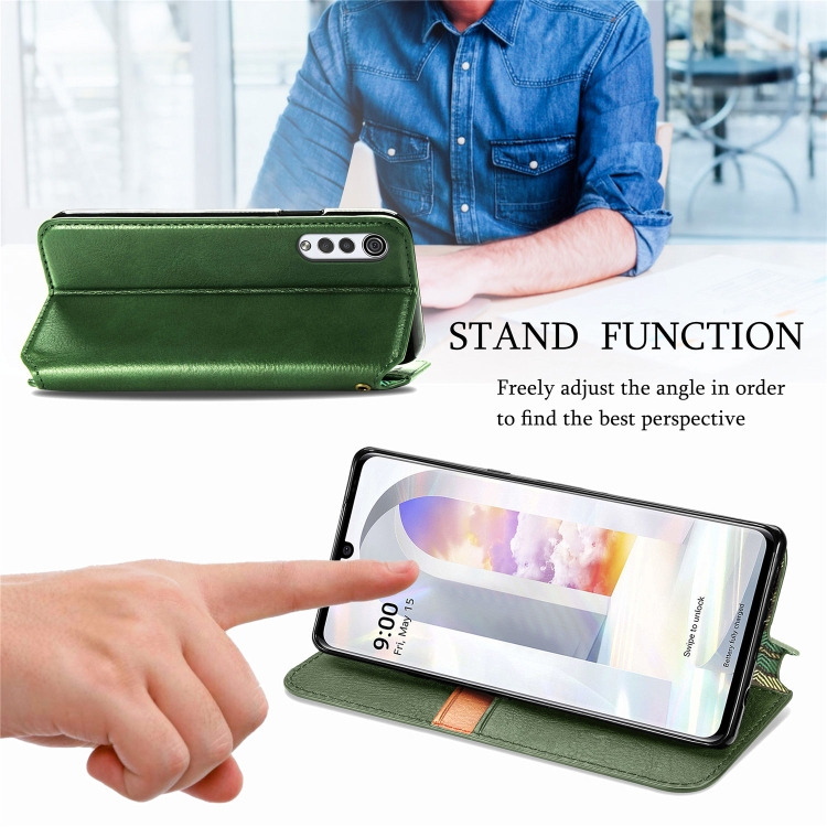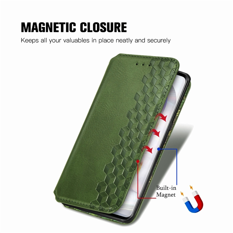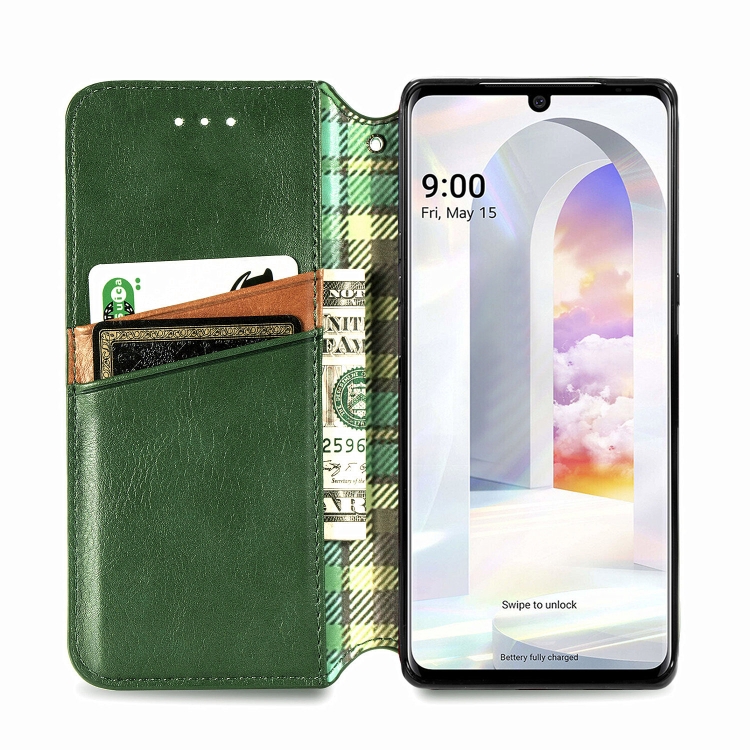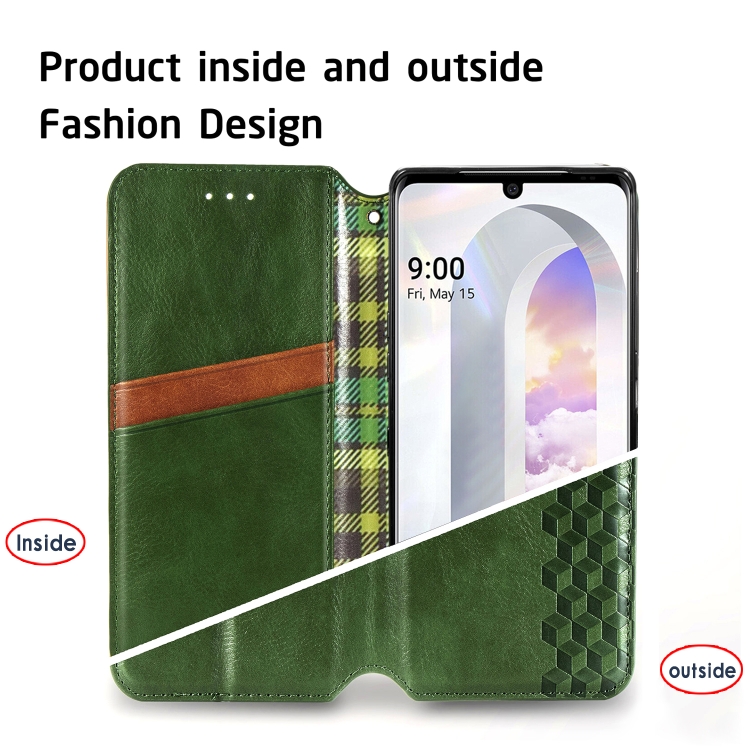 Estuche Cuero PU Magnético para LG Velvet 5G Cubic Grid con Soporte y Billetera (Verde)