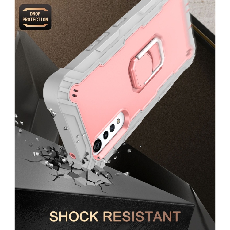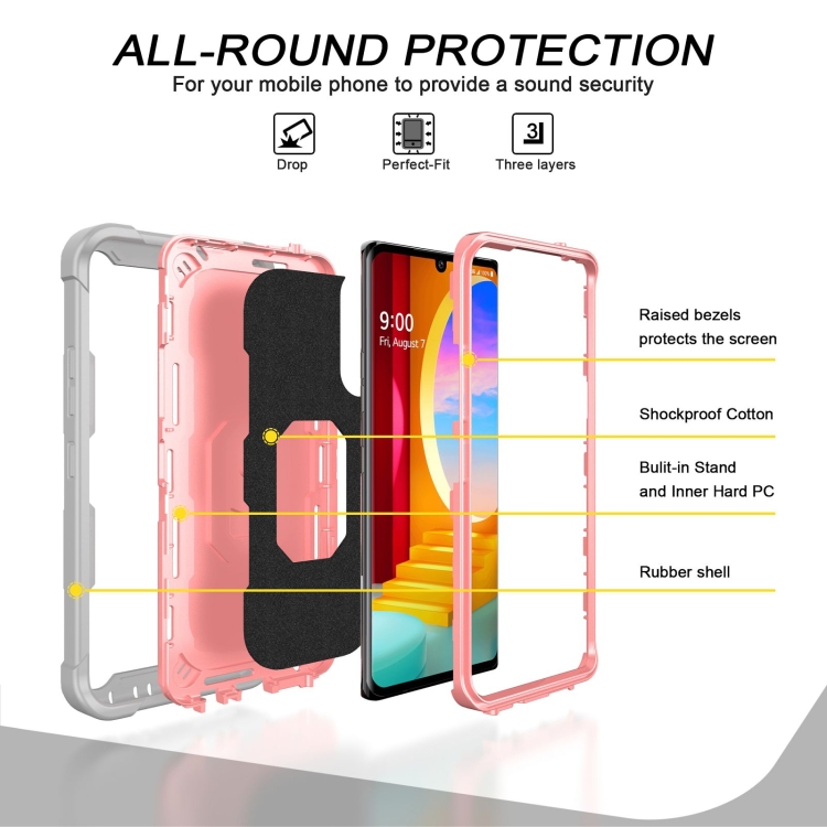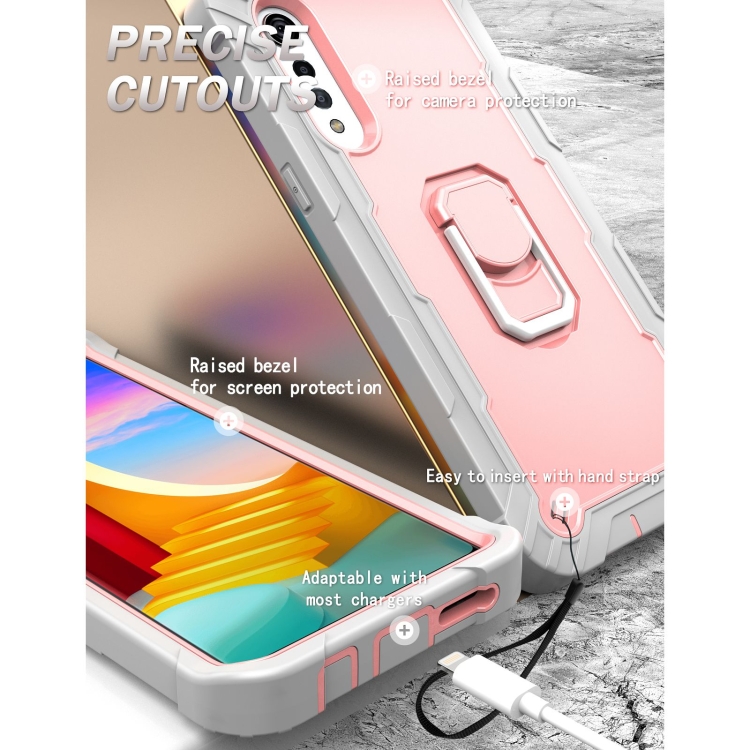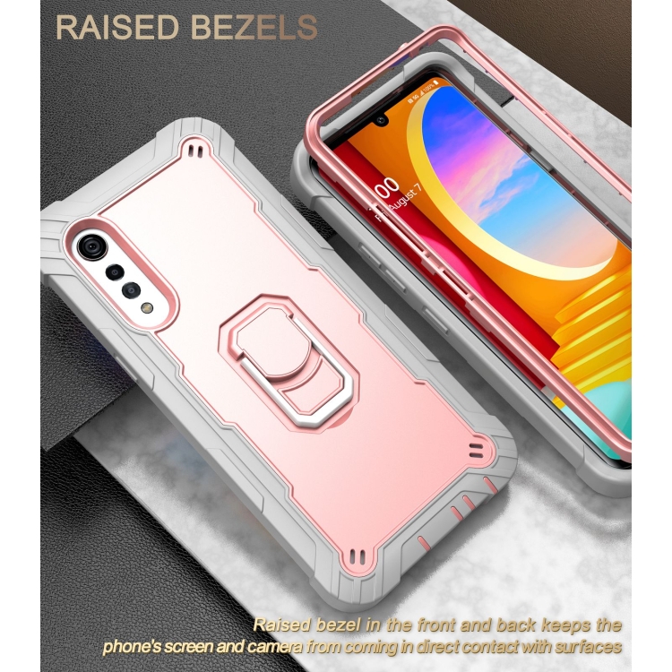 Funda Protectora LG Velvet PC + Caucho 3-Capas a Prueba de Golpes con Soporte Giratorio (Blanco Gris + Oro Rosa)
