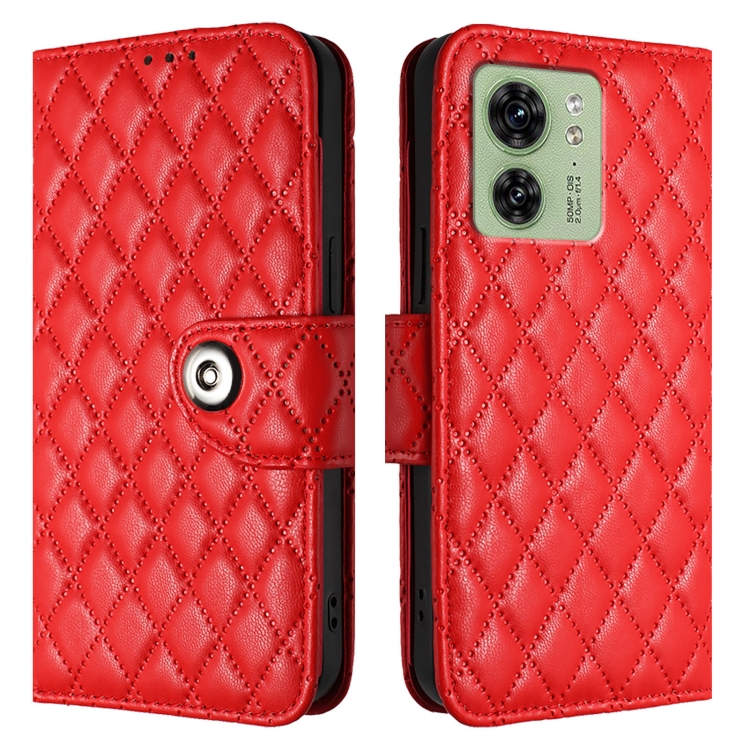 Funda de Cuero para Motorola Edge 40 con Tapa Textura Rómbica y Cordón (Rojo)