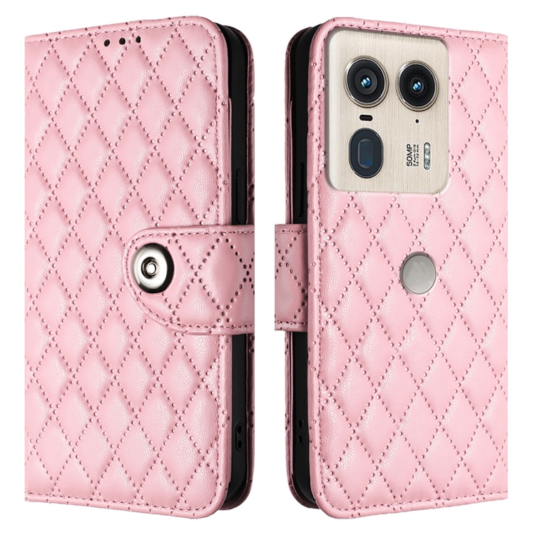 Funda de Cuero para Motorola Edge 50 con Tapa Textura Ultra Romboidal y Cordón (Rosa)