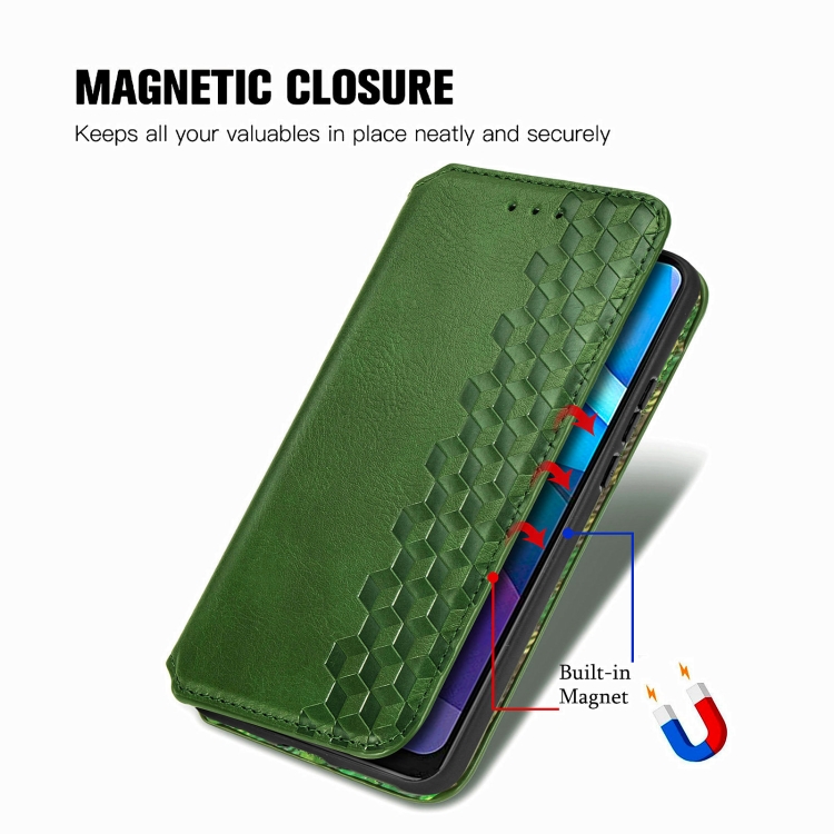 Para Motorola G9 power Cubic Grid Estuche de cuero sintético magnético con tapa horizontal presionado con soporte, ranuras para tarjetas y billetera (verde)