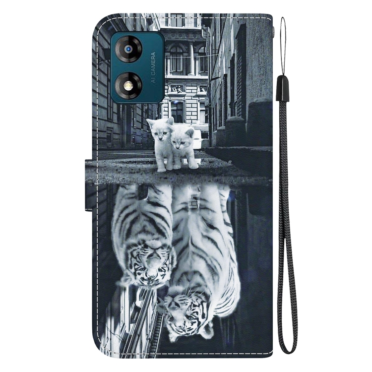 Funda de Cuero para Motorola Moto E13 con Dibujo Coloreado y Textura de Cristal (Reflejo de Tigre Gato)