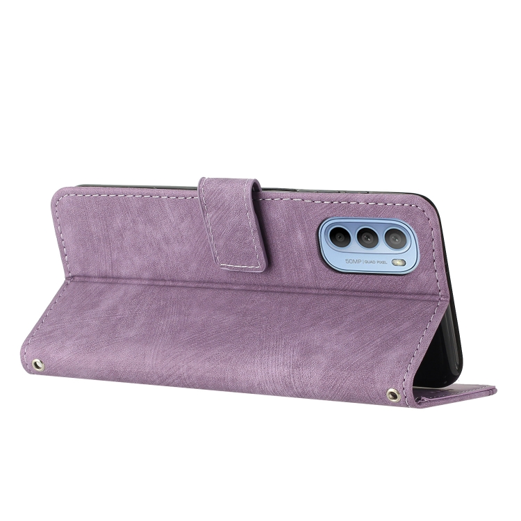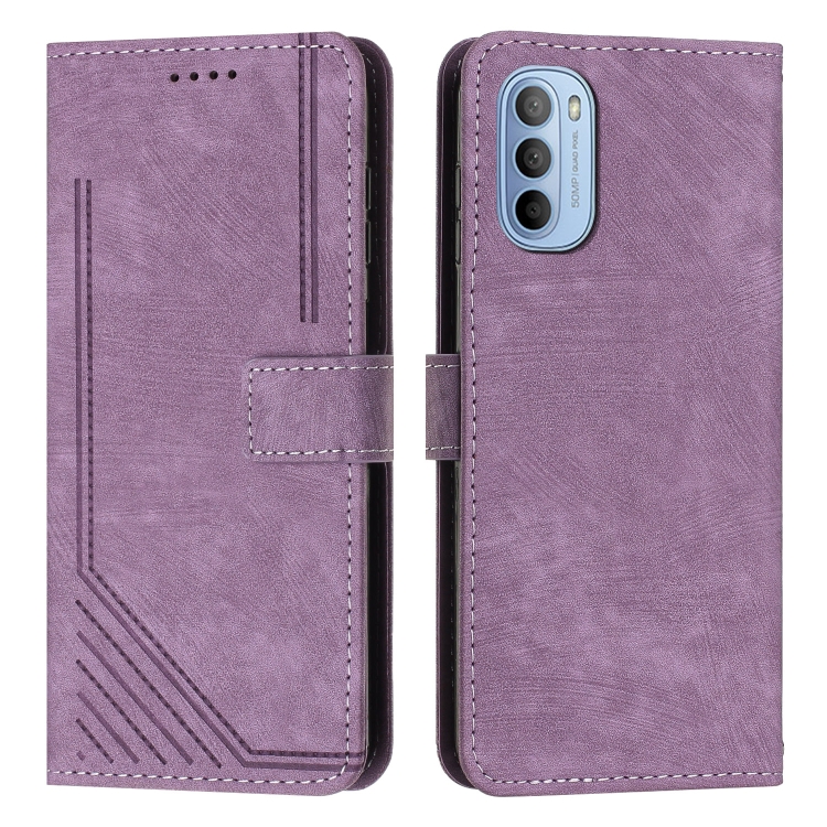 Funda de Cuero para Motorola Moto G Stylus 2022 con Cordón y Patrón Stripe (Púrpura)