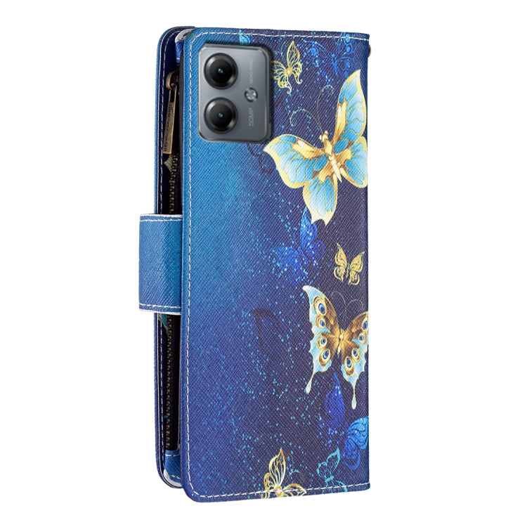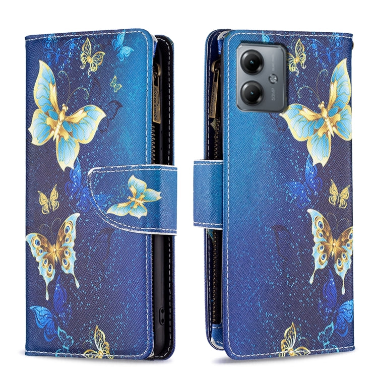 Funda de Cuero para Motorola Moto G14 4G con Cremallera y Dibujo Coloreado (Mariposa Dorada)