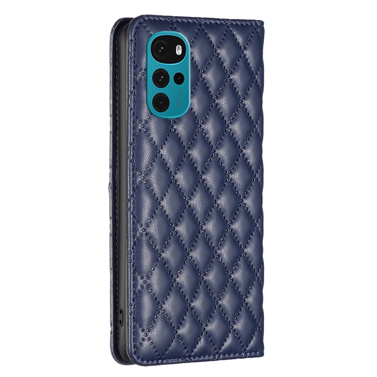 Funda Flip de Cuero Magnética para Motorola Moto G22 con Diseño Diamond Lattice (Azul)