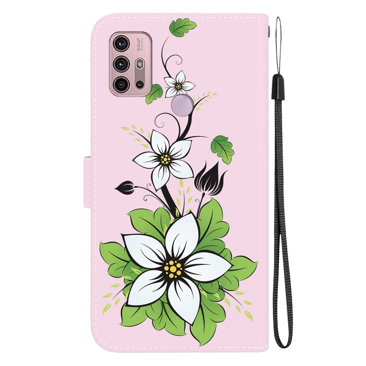 Funda para Motorola Moto G30 / G10 / G20 de Cuero con Dibujo Coloreado y Textura de Cristal (Lirio)