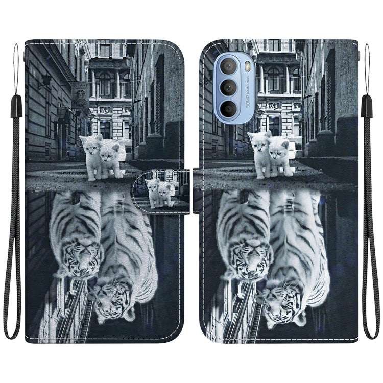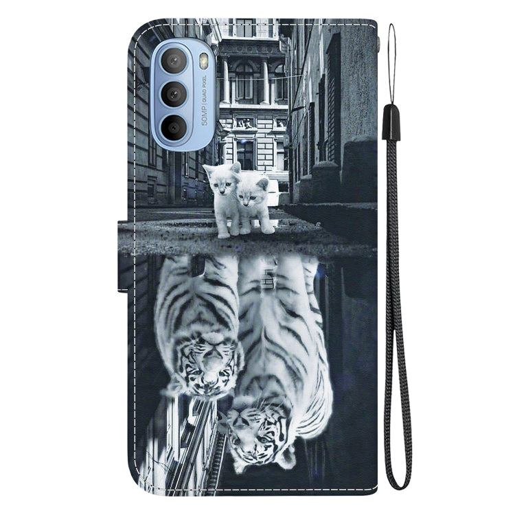 Funda de Cuero para Motorola Moto G51 con Dibujo Coloreado y Textura de Cristal (Reflejo de Tigre de Gato)