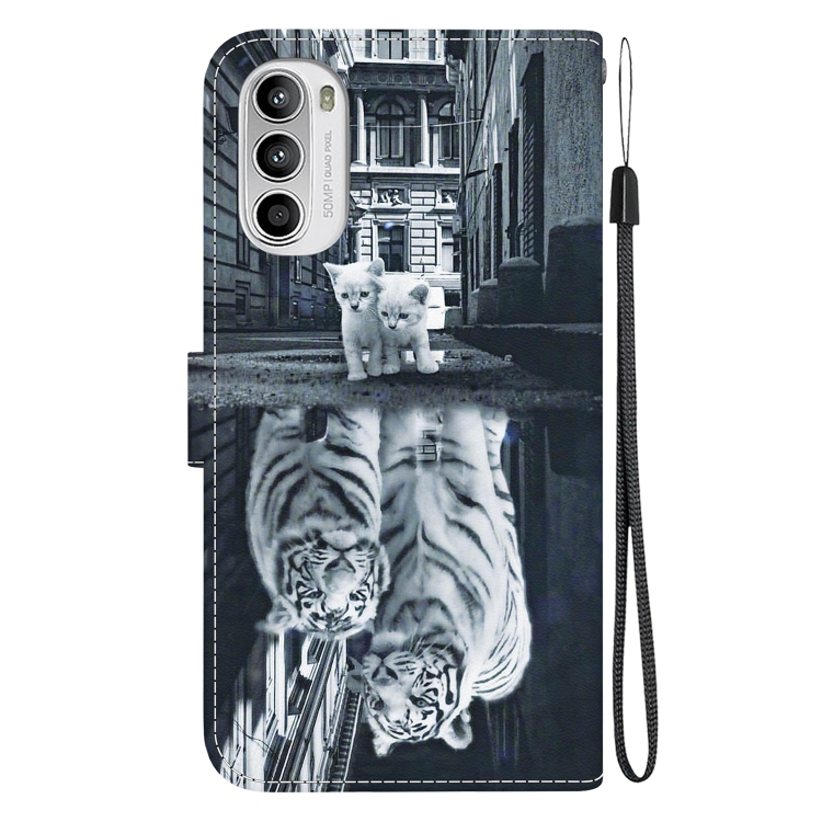 Funda de Cuero para Motorola Moto G52J Jp con Dibujo Coloreado y Textura de Cristal (Reflejo de Tigre Gato)