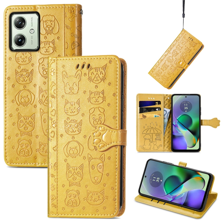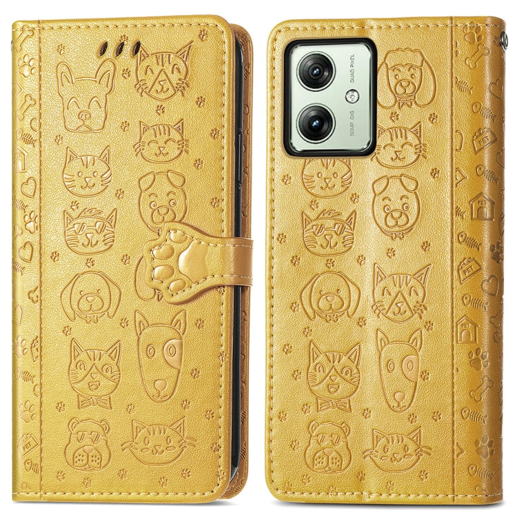 Funda para Motorola Moto G54 5G de Cuero con Relieve de Perro y Gato (Amarillo)
