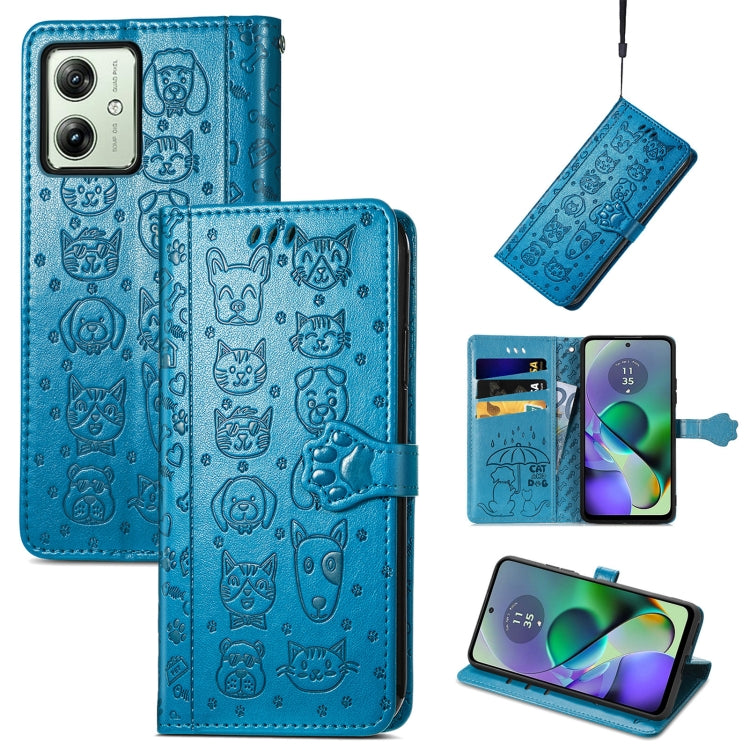 Funda para Motorola Moto G54 5G de Cuero con Relieve de Perro y Gato (Azul)