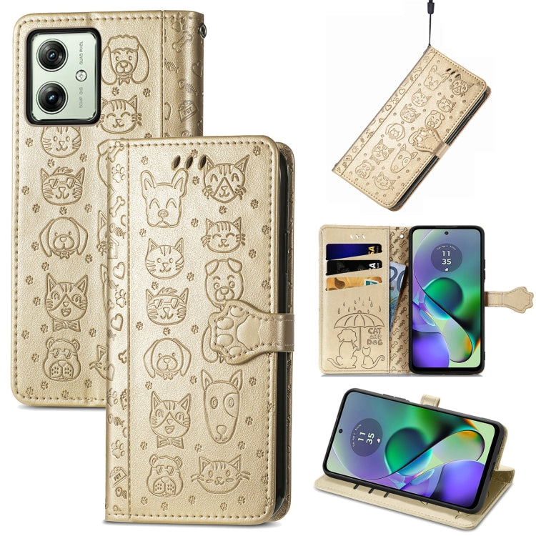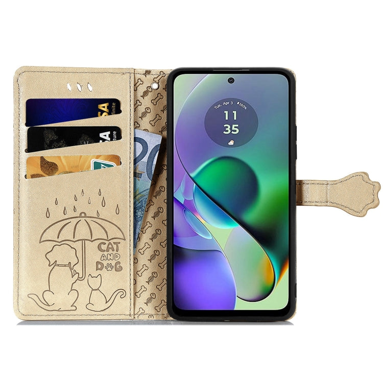 Funda para Motorola Moto G54 5G de Cuero con Relieve de Perro y Gato (Dorado)