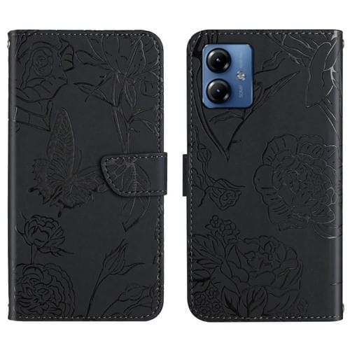 - 1x Funda de Cuero con Tapa en Relieve para Motorola Moto G54 HT03 Skin Feel Butterfly (Negro)