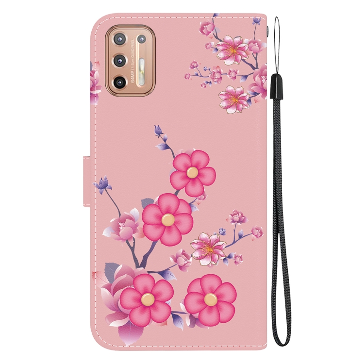 Funda de Cuero para Motorola Moto G9 Plus con Dibujo Coloreado y Textura de Cristal (Flores de Cerezo)