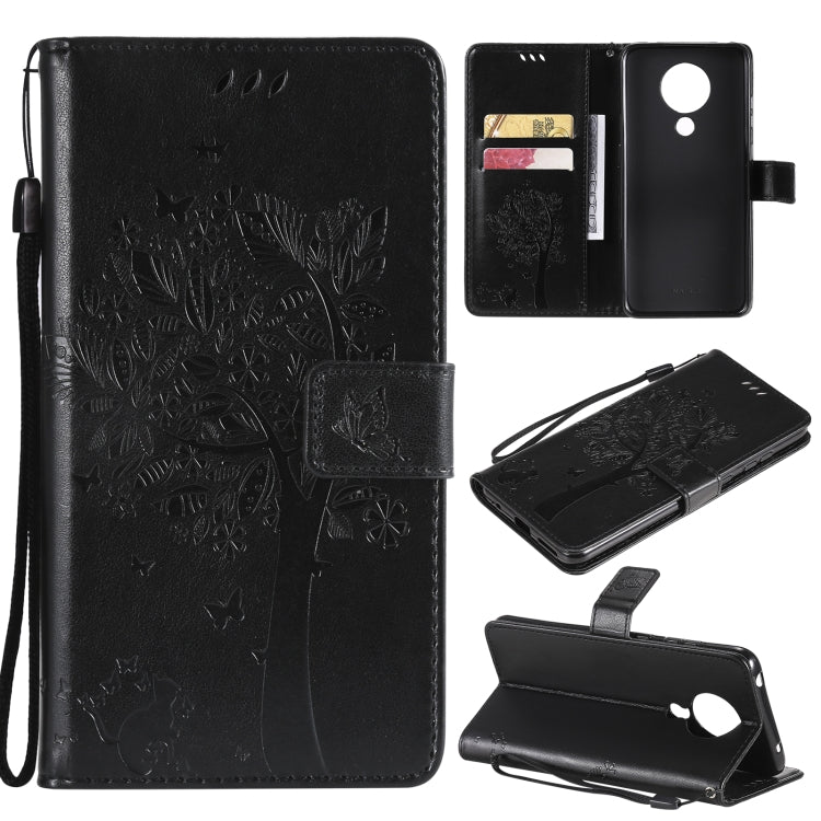 Para Nokia 5.3 Patrón de árbol y gato Impresión prensada Funda de cuero Horizontal Flip PU con soporte y tragamonedas y billetera y cordón (negro)
