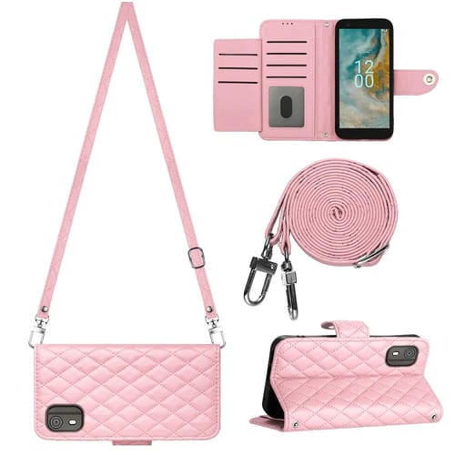 Funda para Nokia C02 de Cuero con Tapa, Textura Rómbica y Cordón Largo (Rosa)