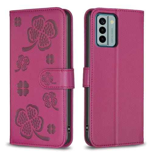 Funda de Cuero para Nokia G22 con Relieve de Cuatro Hojas (Rojo Rosa)