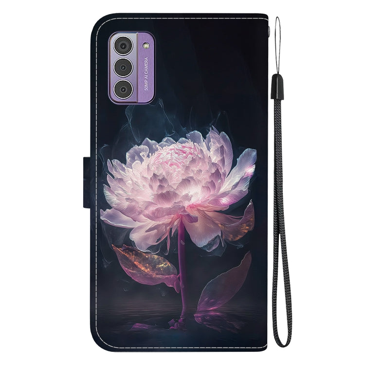 Estuche de Cuero para Nokia G42 con Dibujo Coloreado y Textura de Cristal (Peonía Púrpura)