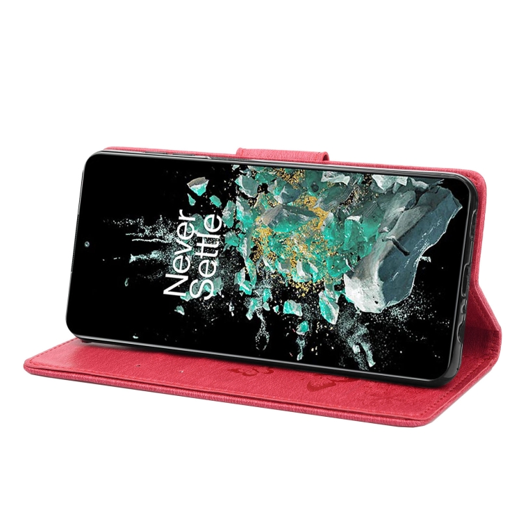 Estuche para OnePlus 10T de Cuero con Tapa Horizontal y Relieve de Mariposa (Rojo)