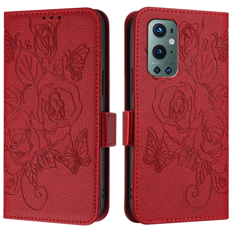 Funda de Cuero Antirrobo RFID para OnePlus 9 Pro con Relieve Rosa (Rojo)