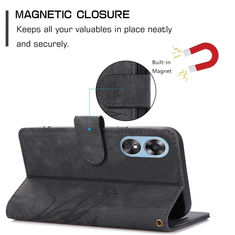 Para Oppo A17 / A17K Funda para Teléfono de Cuero con Relieve de Mariposa Orquídea (Negro)