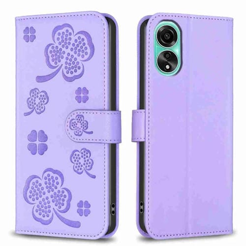 Para Oppo A78 4G Funda de Teléfono de Cuero con Relieve de Cuatro Hojas (Púrpura)