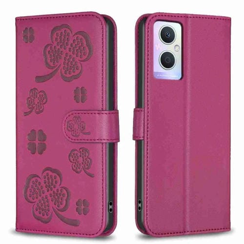 Para Oppo A96 5G / Reno7 Z Funda para Teléfono de Cuero con Relieve de Cuatro Hojas (Rojo Rosa)