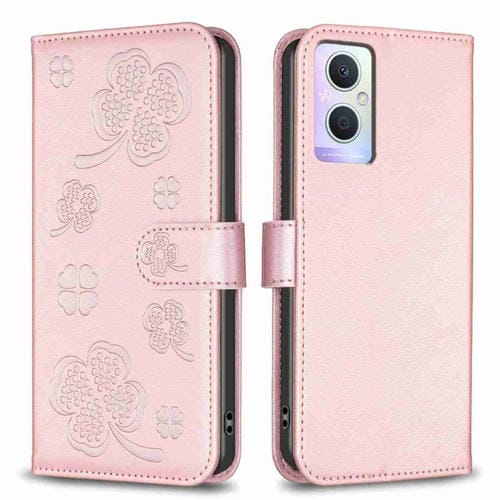 Para Oppo A96 5G / Reno7 Z Funda para Teléfono de Cuero con Relieve de Cuatro Hojas (Rosa)