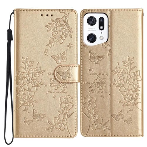 Para Oppo Find X5 Pro Butterfly Love Flower Funda de Cuero para Teléfono En Relieve (Oro)