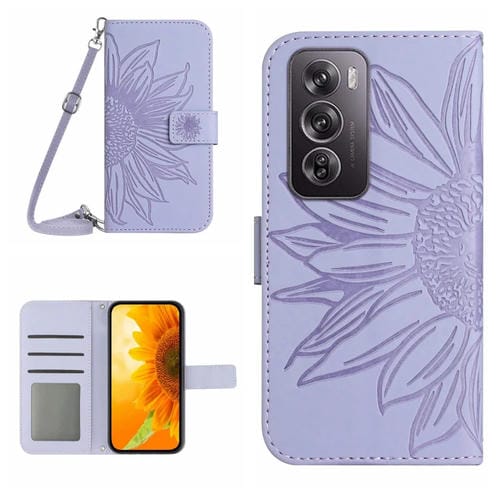 Para Oppo Reno 12 5G Global Skin Feel Funda para Teléfono de Cuero con Tapa En Relieve de Girasol y Cordón (Púrpura)
