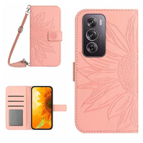 Para Oppo Reno 12 5G Global Skin Feel Funda para Teléfono de Cuero con Tapa En Relieve de Girasol y Cordón (Rosa)
