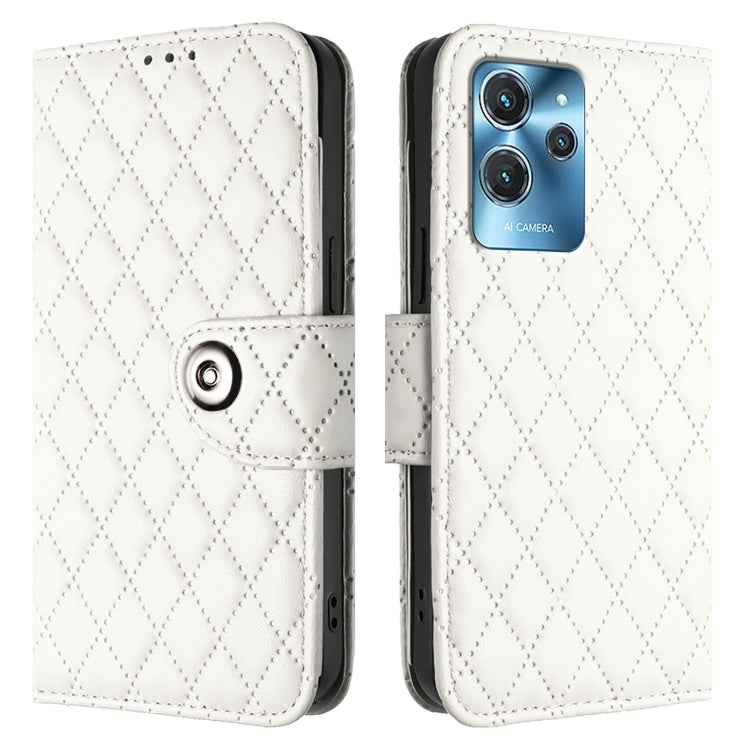 Funda de Cuero para Oukitel C32 con Tapa Textura Rómbica y Cordón (Blanco)