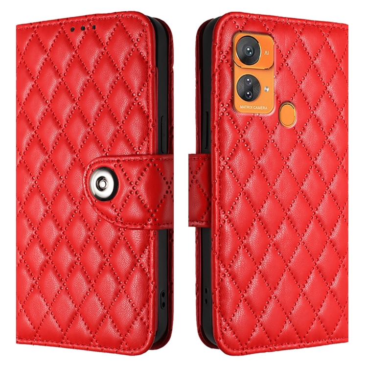 Funda para Oukitel C33 de Cuero con Tapa Textura Rómbica y Cordón (Rojo)