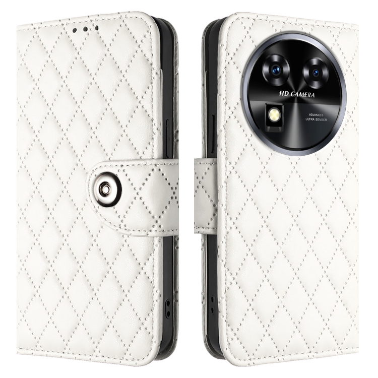 Funda de Cuero para Oukitel C37 con Tapa Textura Rómbica y Cordón (Blanco)