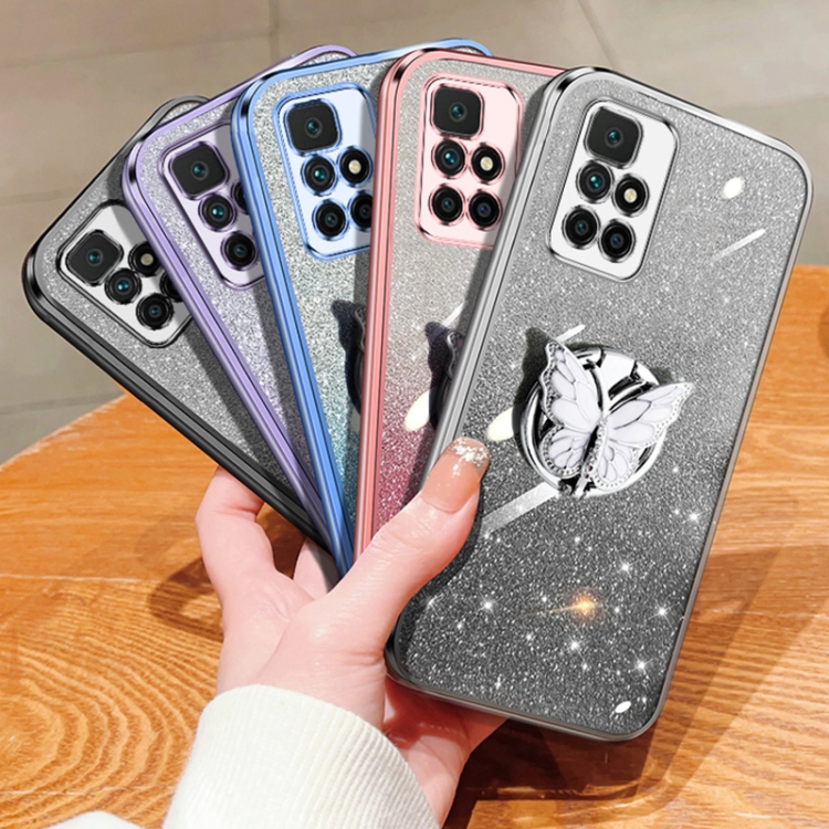 Para Redmi 10 Funda para Teléfono de TPU con Soporte de Mariposa con Brillo Degradado Plateado (Rosa)