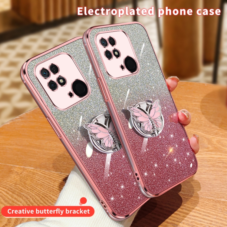 Para Redmi 10C Funda para Teléfono de TPU con Soporte de Mariposa con Brillo Degradado Plateado (Plata)