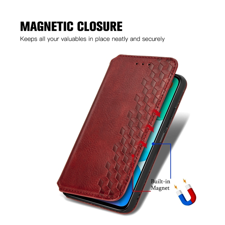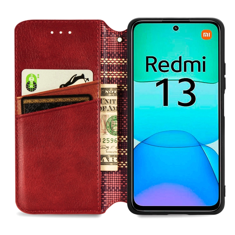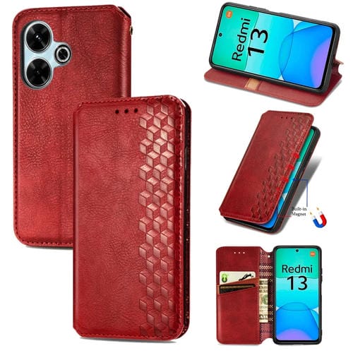 Para Redmi 13 4G Cubic Grid Funda de Teléfono de Cuero Magnético Prensado (Rojo)